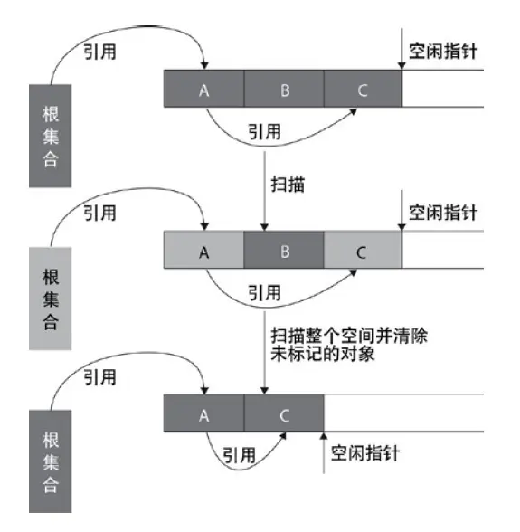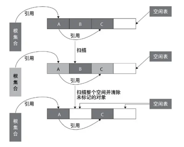 标记—清除算法是最基础的收集算法,为了解决引用计数法的问题而提出。它使用了根集的概念,它分为“标记”和“清除”两个阶段:首先标记出所需回收的对象,在标记完成后统一回收掉所有被标记的对象,它的标记过程其实就是前面的根搜索算法中判定垃圾对象的标记过程。